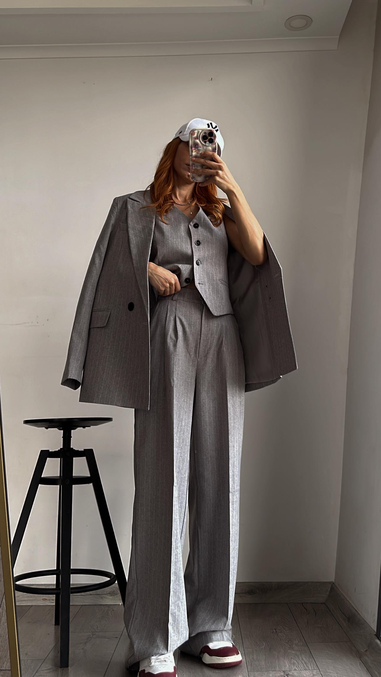 GRİ ÇİZGİLİ YELEKLİ PİLE DETAY PALAZZO OVERSİZE CEKET TAKIM ELBİSE