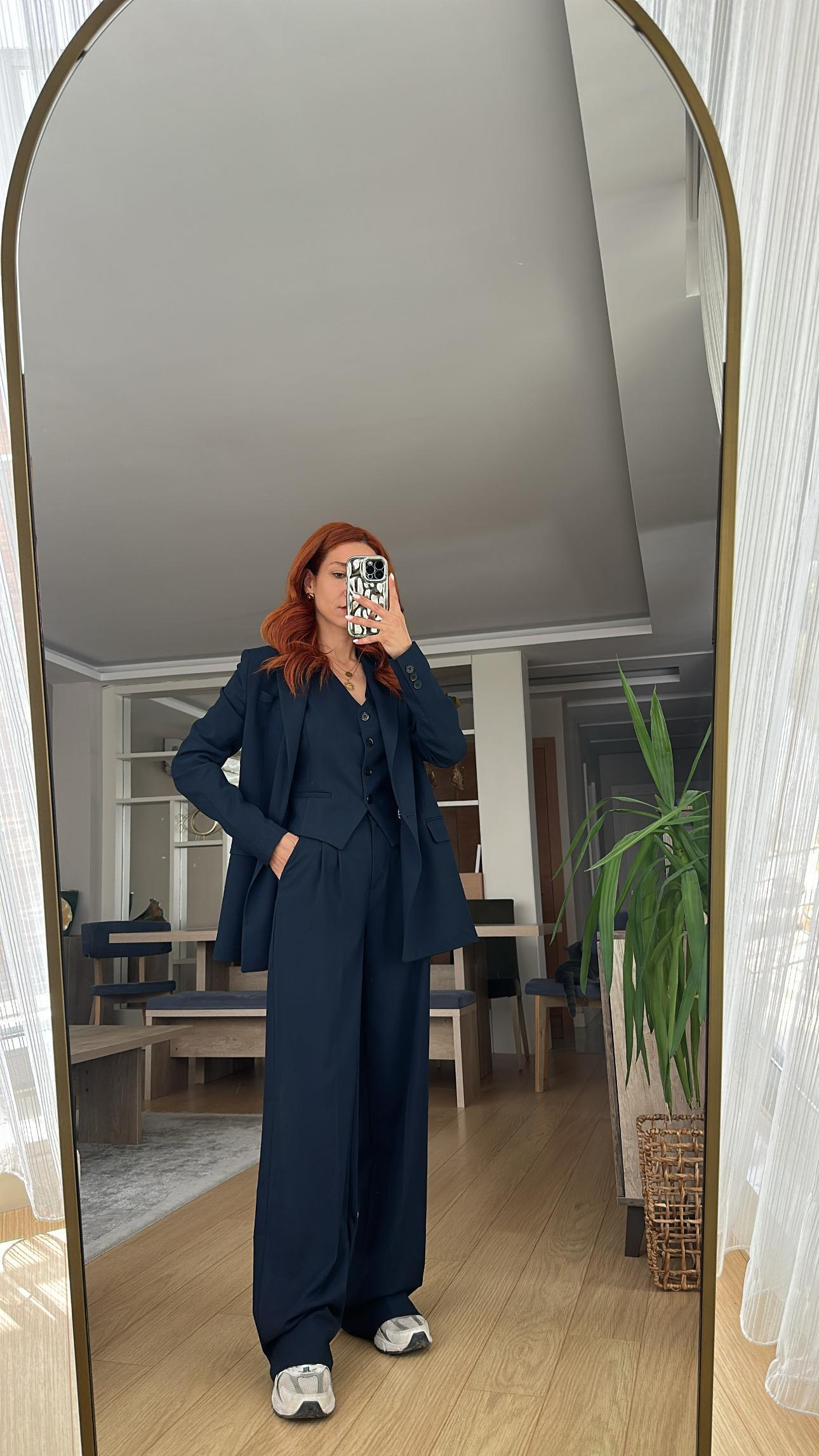 LACİVERT YELEKLİ PİLE DETAY PALAZZO OVERSİZE CEKET TAKIM ELBİSE