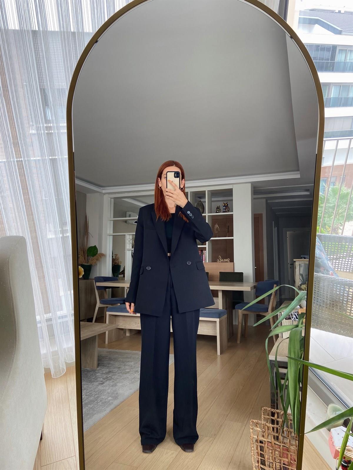 SİYAH PİLE DETAY PALAZZO PANTOLON CEKET TAKIM ELBİSE1 (St4628)