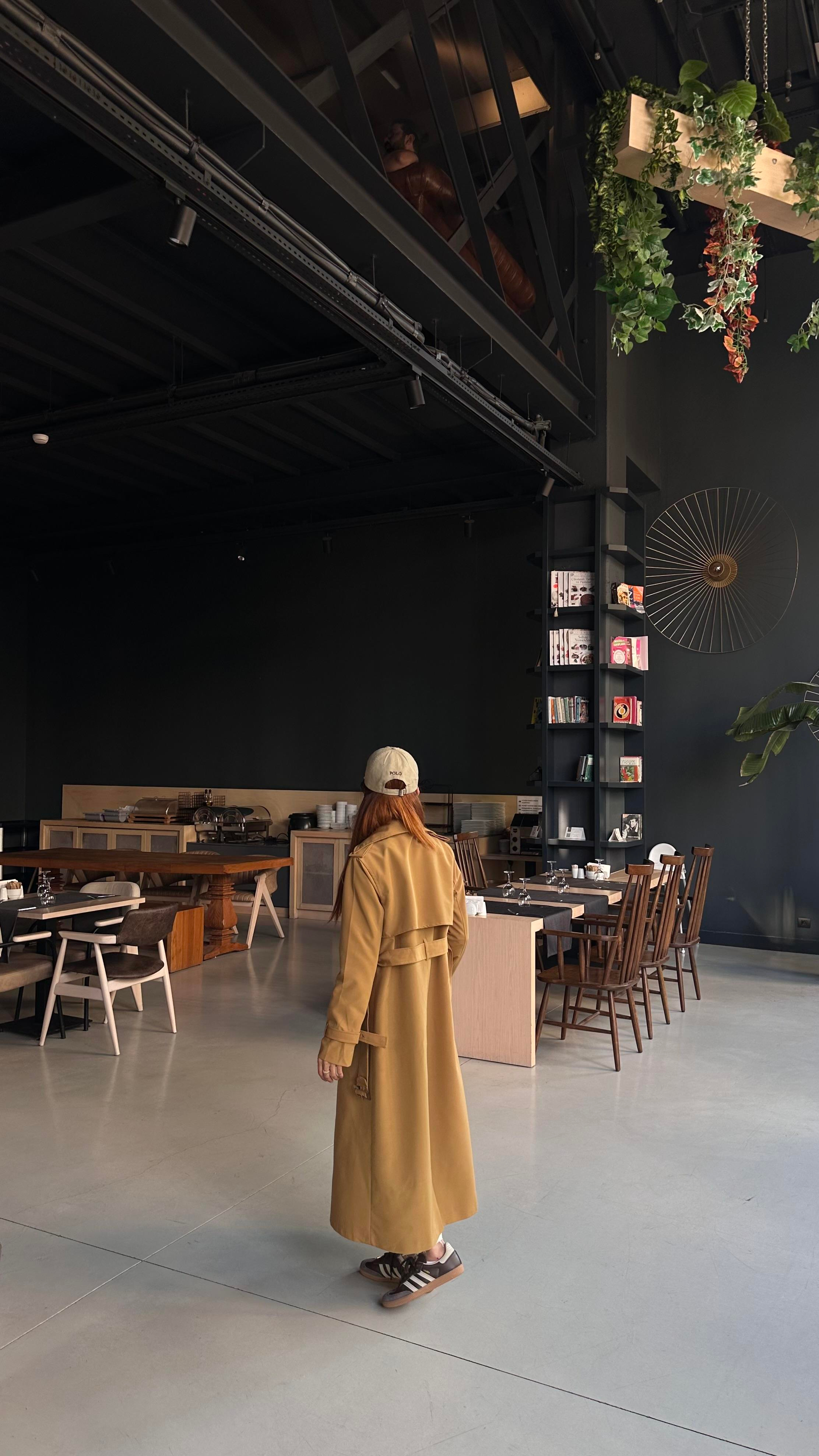 %100 pamuk ipliğinden üretilmiş trençkot. Çentikli yaka ve düğmeli, kayışlı, uzun kollu. Ön cepli. Aynı kumaştan bağcıklı, ayarlanabilir kemerli. Önden kruvaze düğme kapamalı.